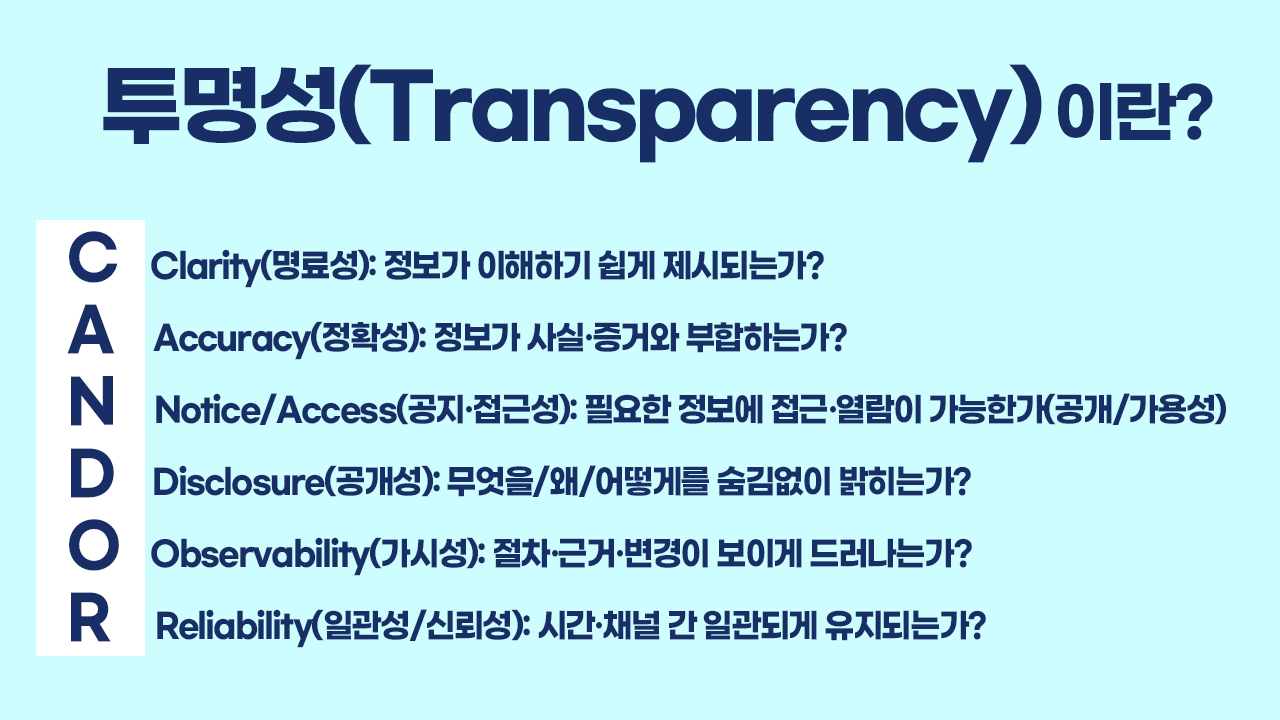 투명성의 개념을 설명하는 또 하나의 프레임으로는 CANDOR로 설명할 수 있다. ‘candor’는 솔직한을 뜻하는 단어로써 투명성은 열려있어야 하고, 솔직해야 한다는 의미다. 구체적으로 명료성, 정확성, 공지성, 공개성, 가시성, 일관성의 개념을 포함한다.